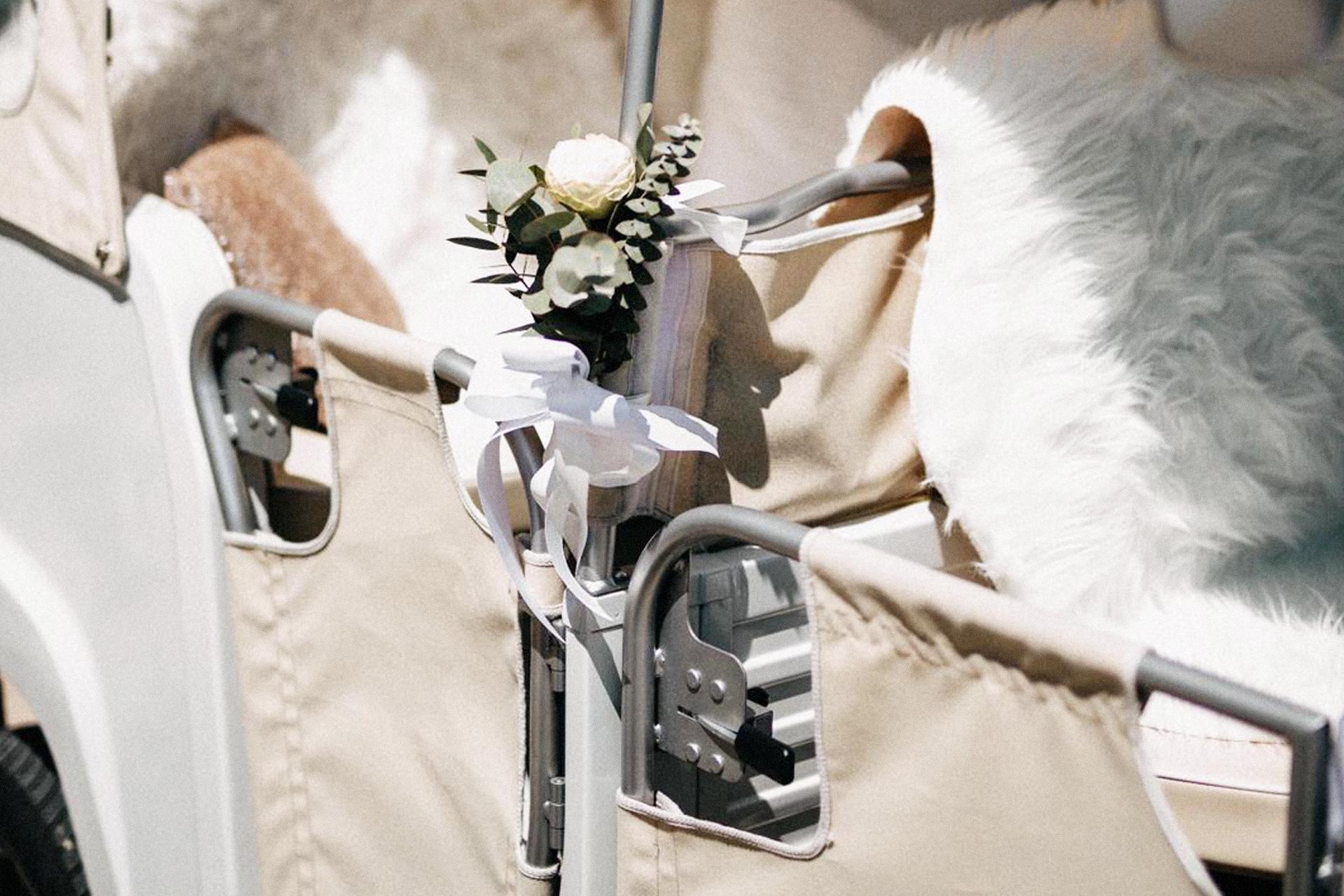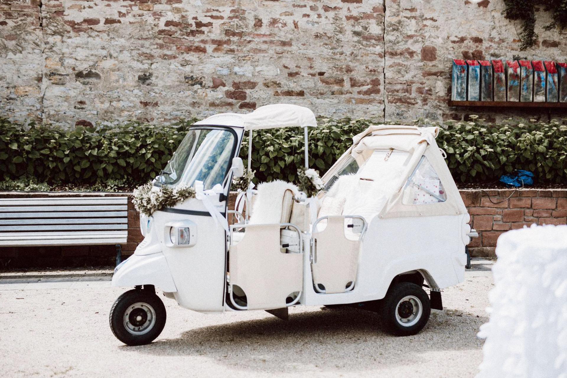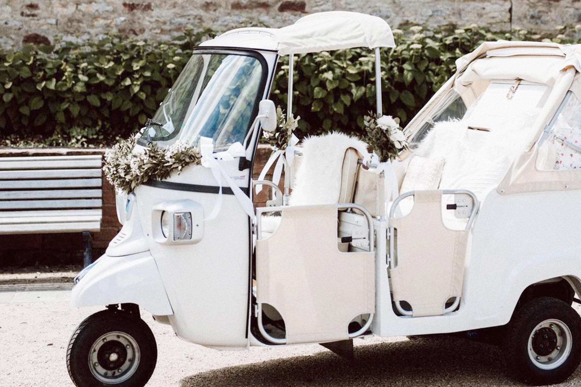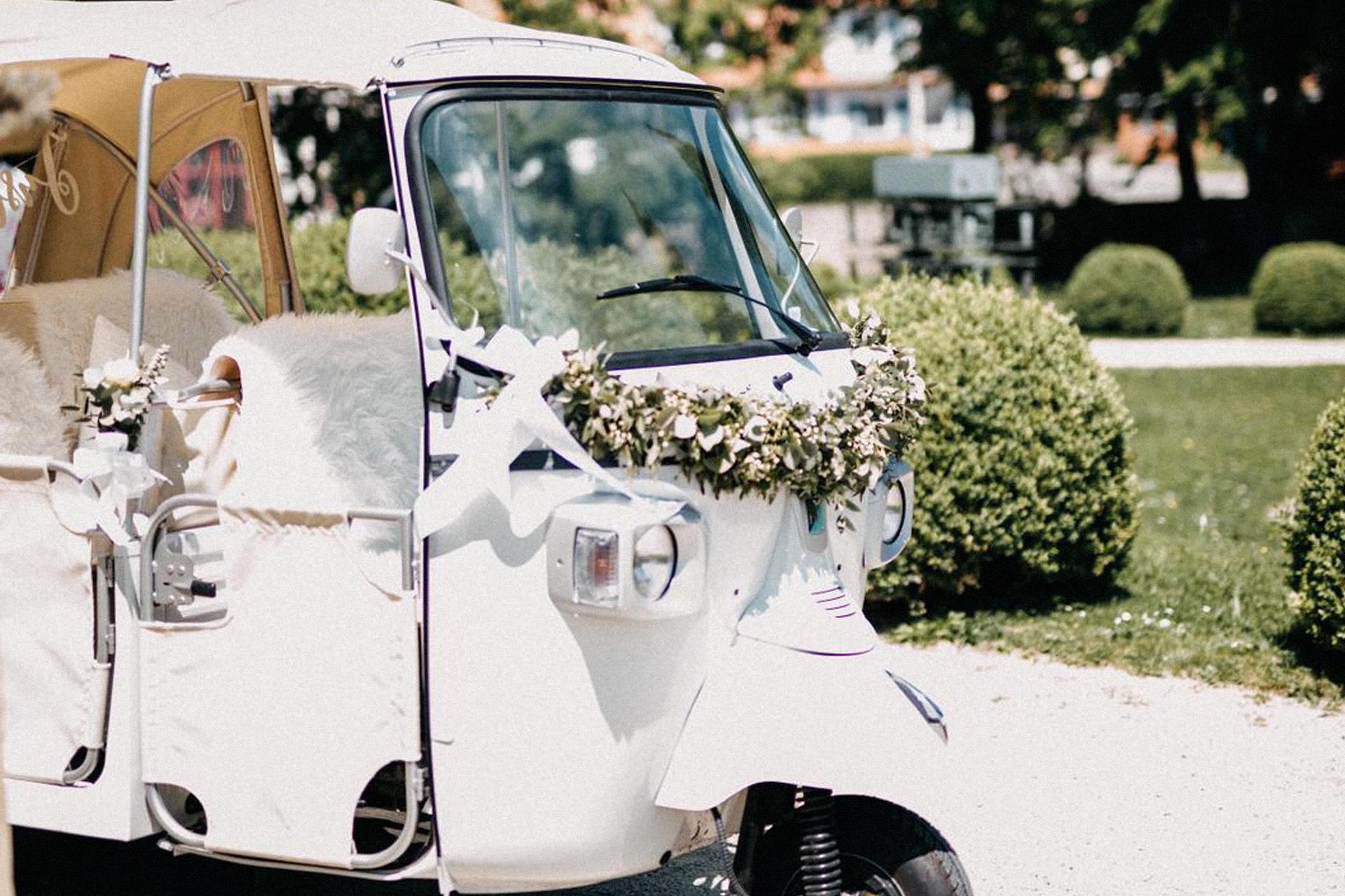 Mit der stylischen und nach Ihren Wünschen hochzeitlich geschmückten Ape Calessino, ihrem Verdeck und den 3 Sitzplätzen, wird jede Fahrt zu einem unvergesslichen Erlebnis ... Ihre Fahrt ins gemeinsame Glück.